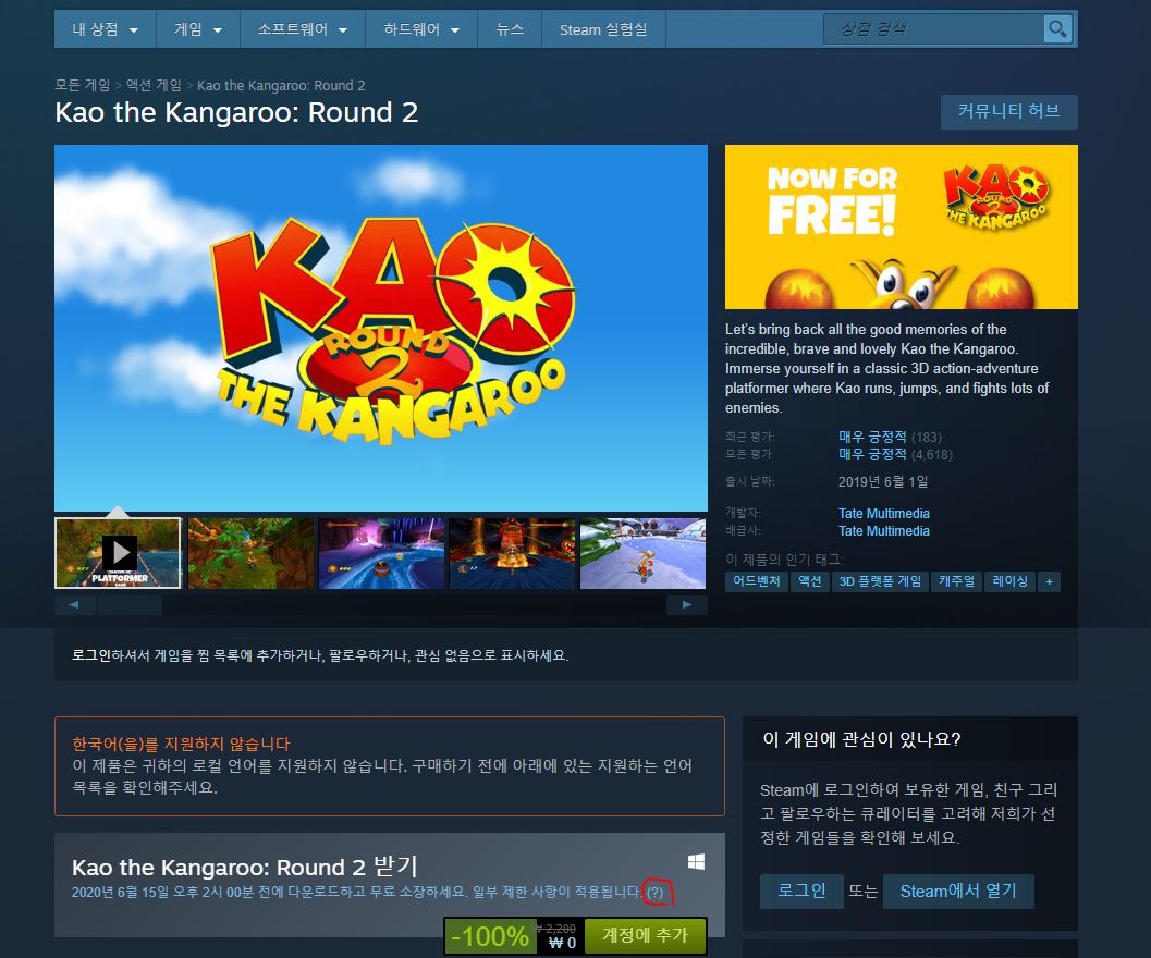 이번에 무료로 배포되는 게임은 Kao the Kangaroo : Round 2 라는 게임입니다.