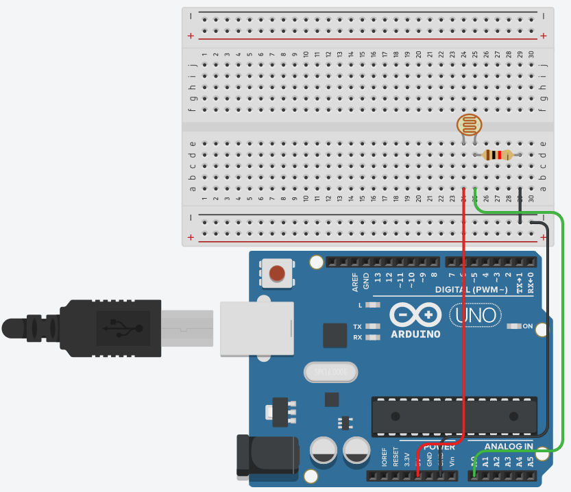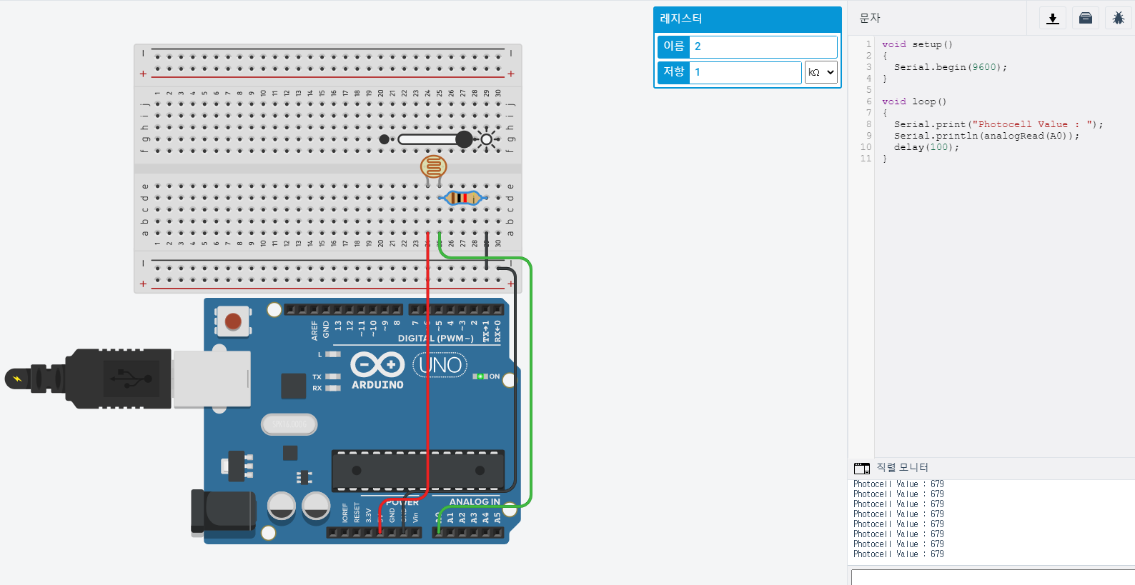 만약, 저항이 연결되어 있지 않은 상태에서 전원을 켰다면 실제 회로에서는 조도 센서가 타버릴 수 있습니다.