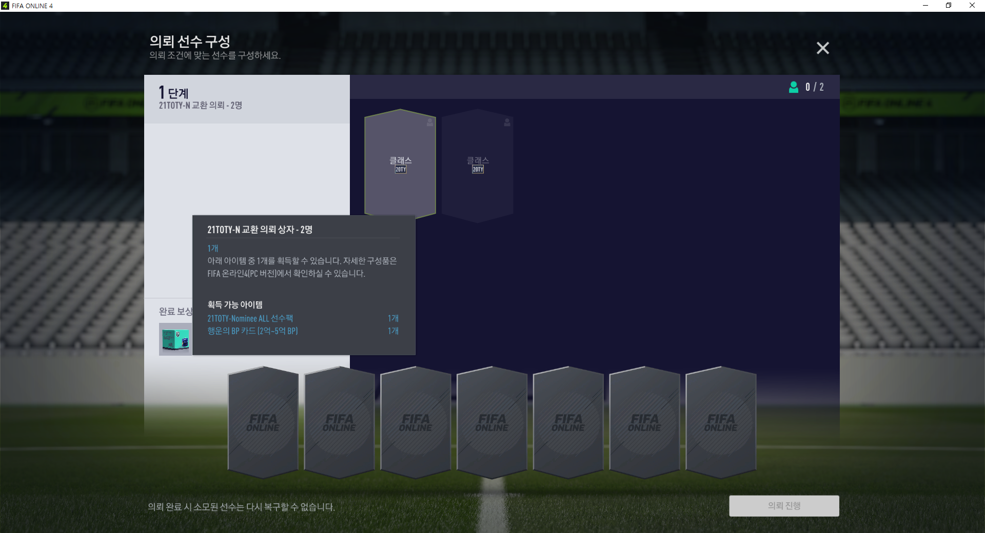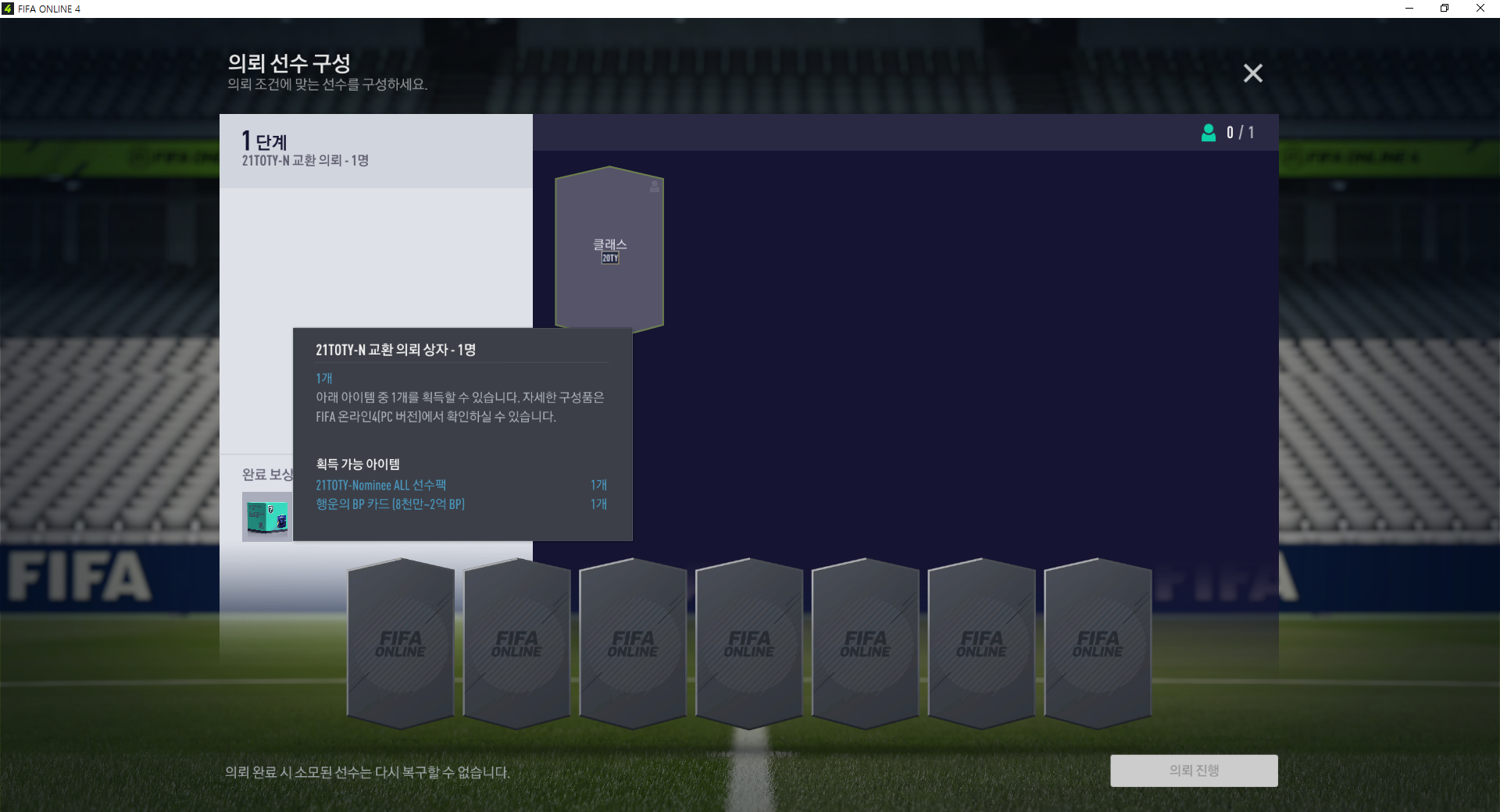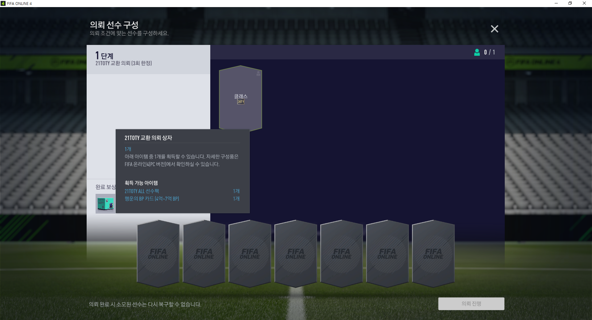 20TOTY 1장을 재료로 사용해 상자를 받는데, 상자는 21토티 선수팩과 4~7억 BP카드가 들어있습니다. 3회 한정이구요.