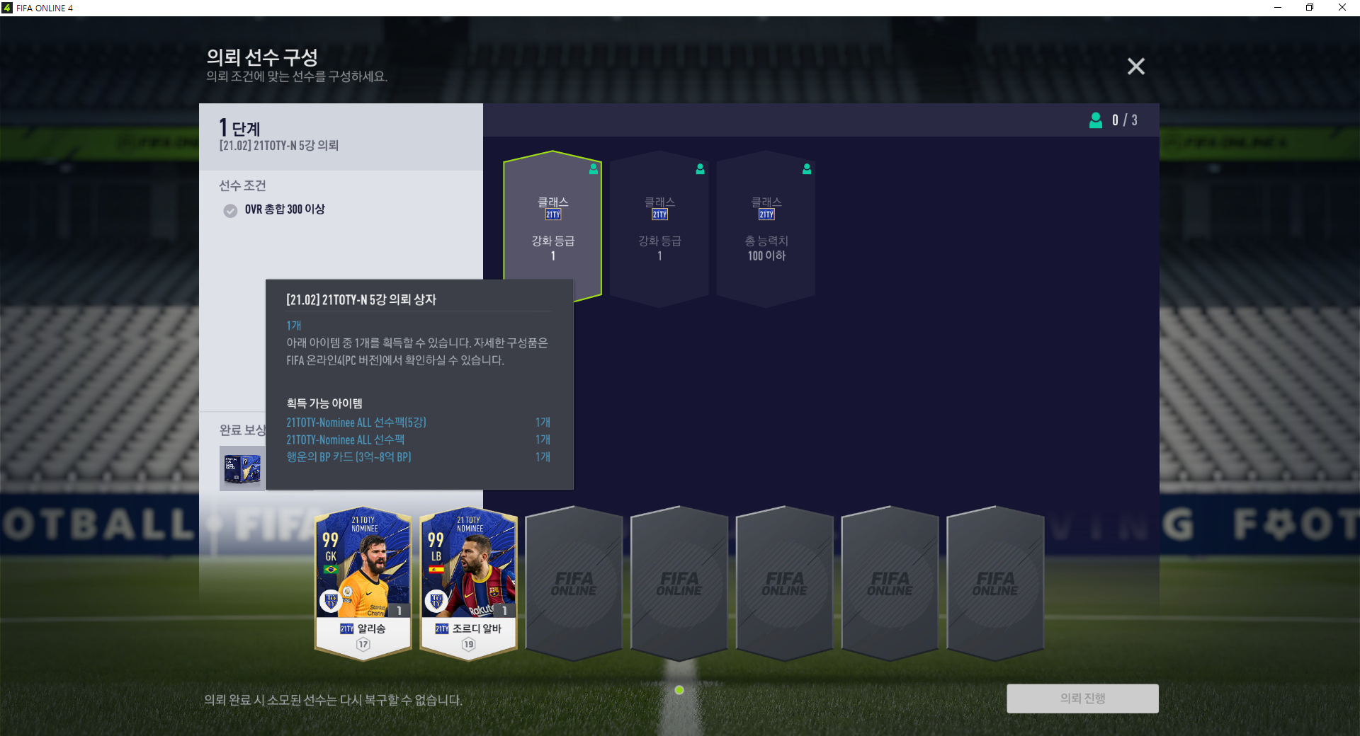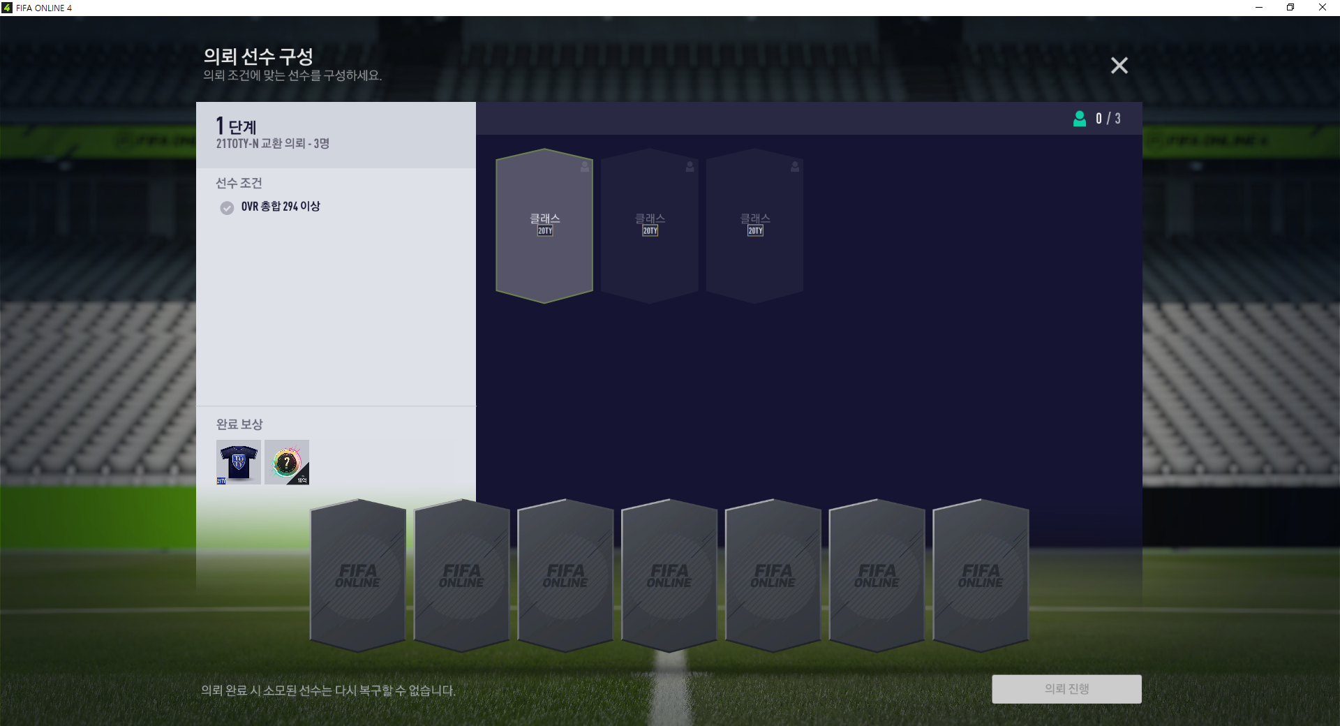 노미니 3장을 2장은 1카, 1장은 강화등급 상관없이 오버롤 100이하 선수를 재료로 사용해야합니다.