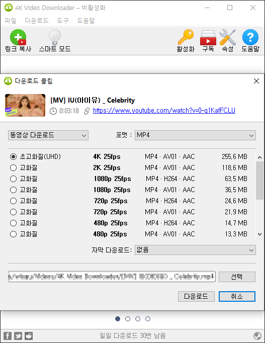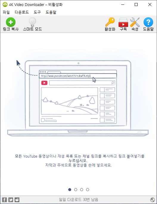 여기서 무료 버전의 아쉬운 점은 하루에 영상을 30개까지만 다운받을 수 있습니다.