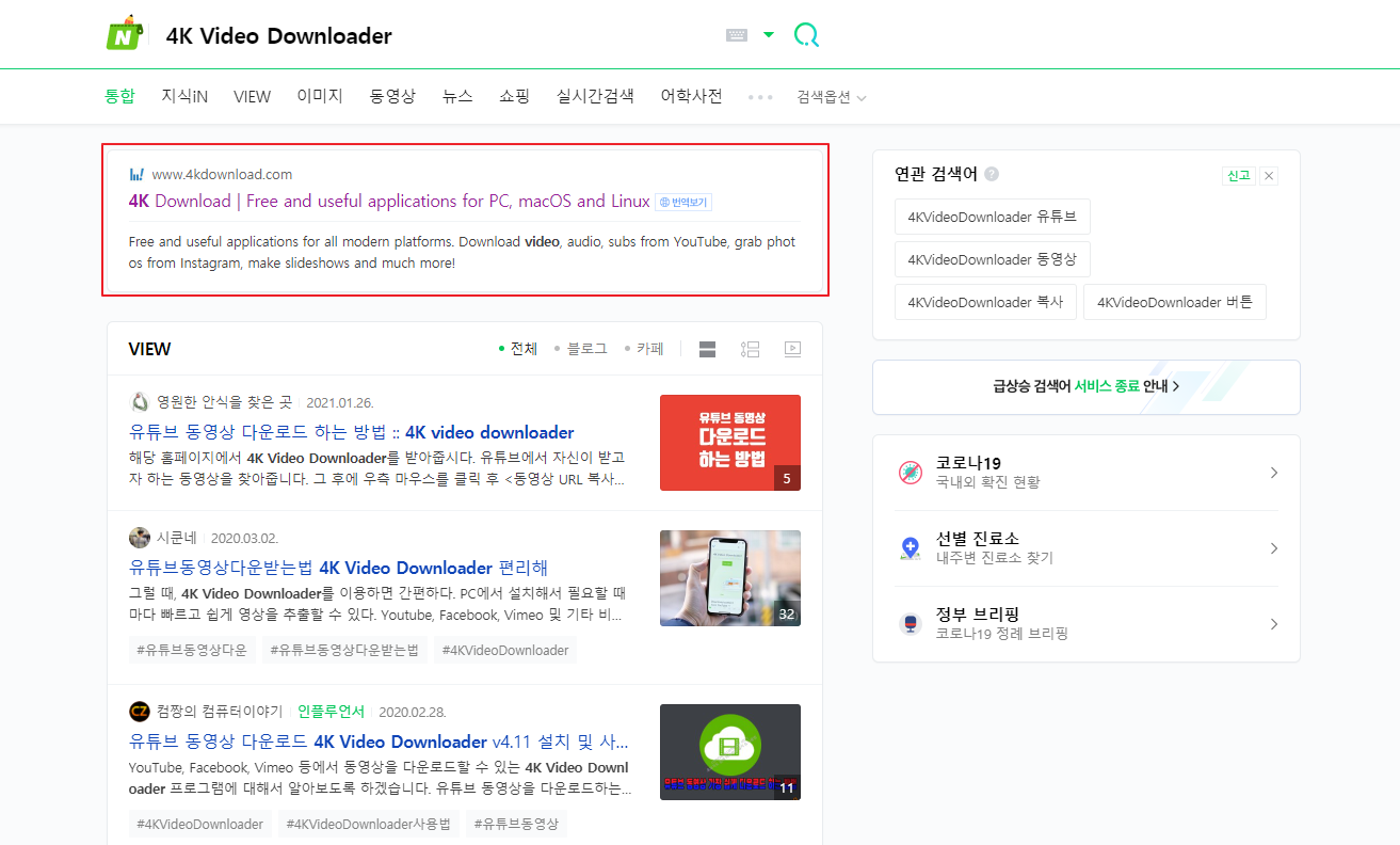 먼저 네이버에 4K까지만 검색해도 연관검색어로 Video Downloader가 자동 완성 목록에 뜨거든요.