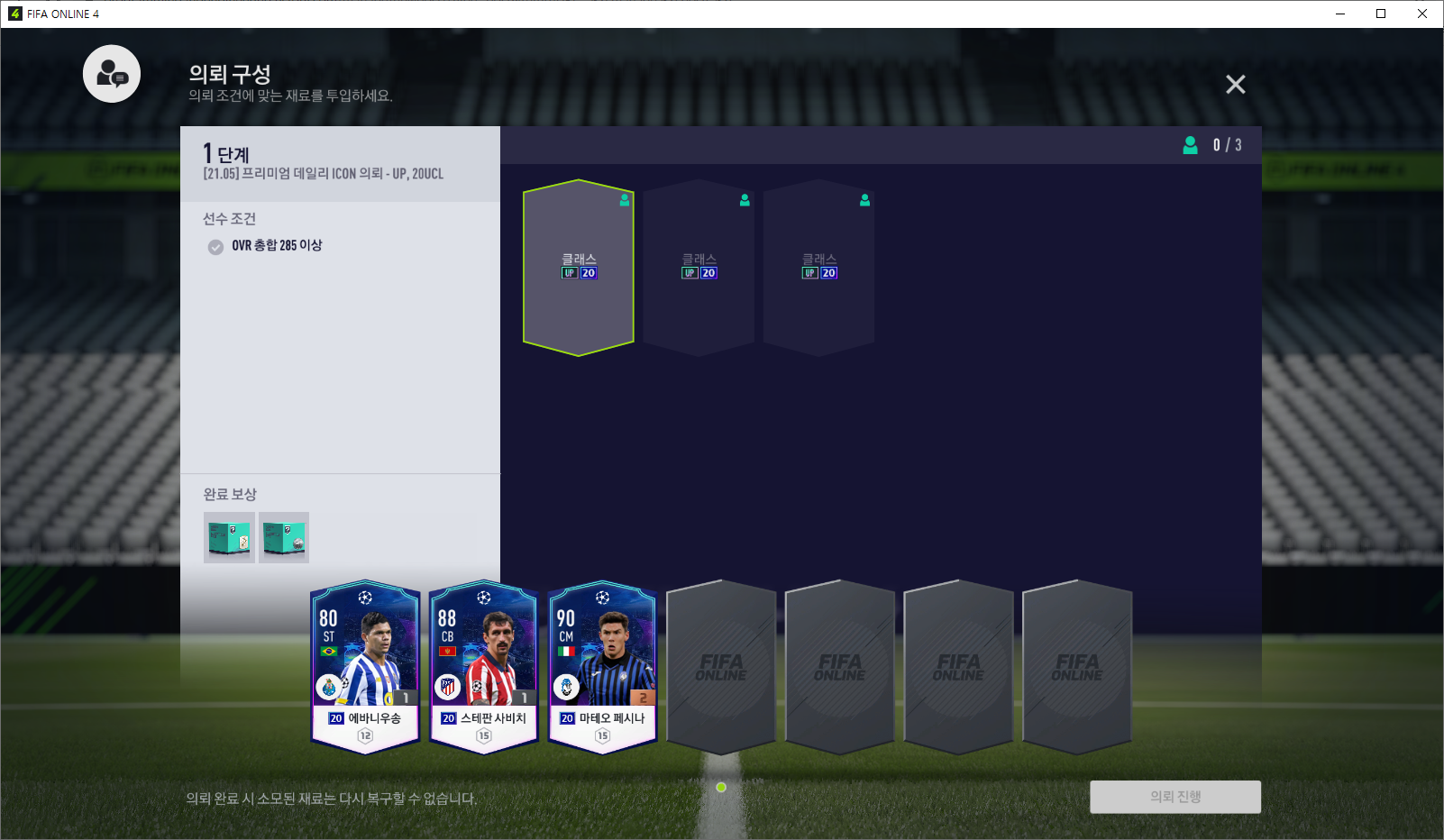 재료는 UP시즌, 20챔스 시즌 3장이구요. 강화등급 제한은 없고 3장의 오버롤 합이 285이상이어야 합니다.