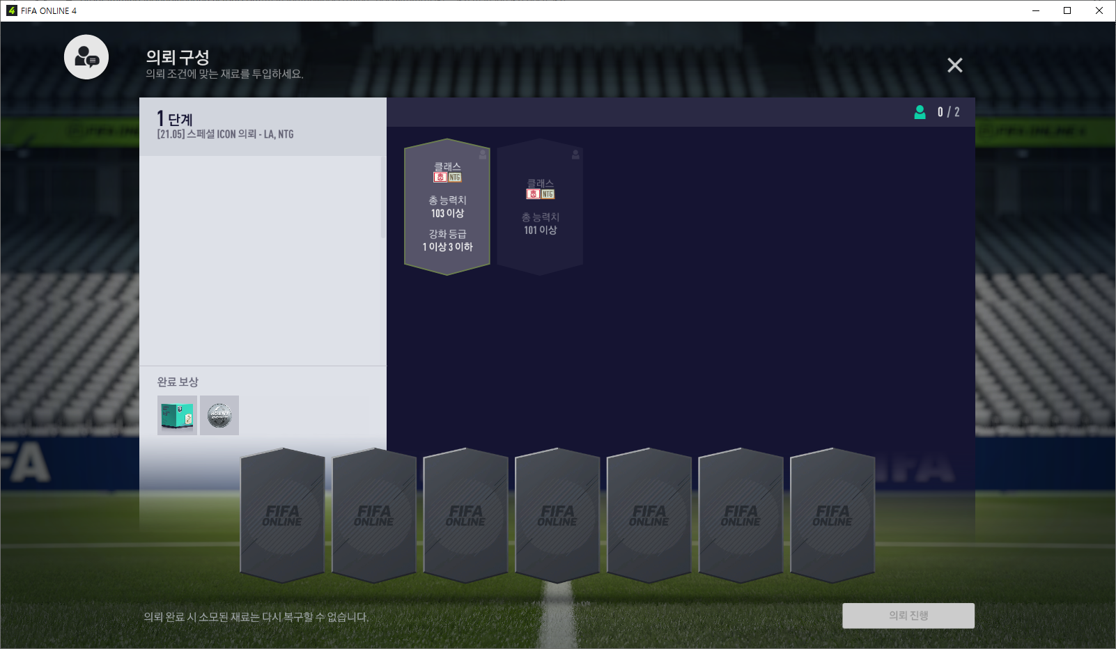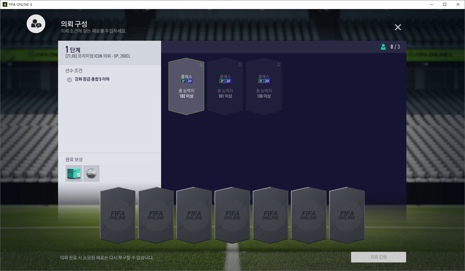 재료는 UP 시즌, 20UCL 시즌 2장과 시즌 상관없는 카드 1장입니다. 강화등급 제한도 없습니다.