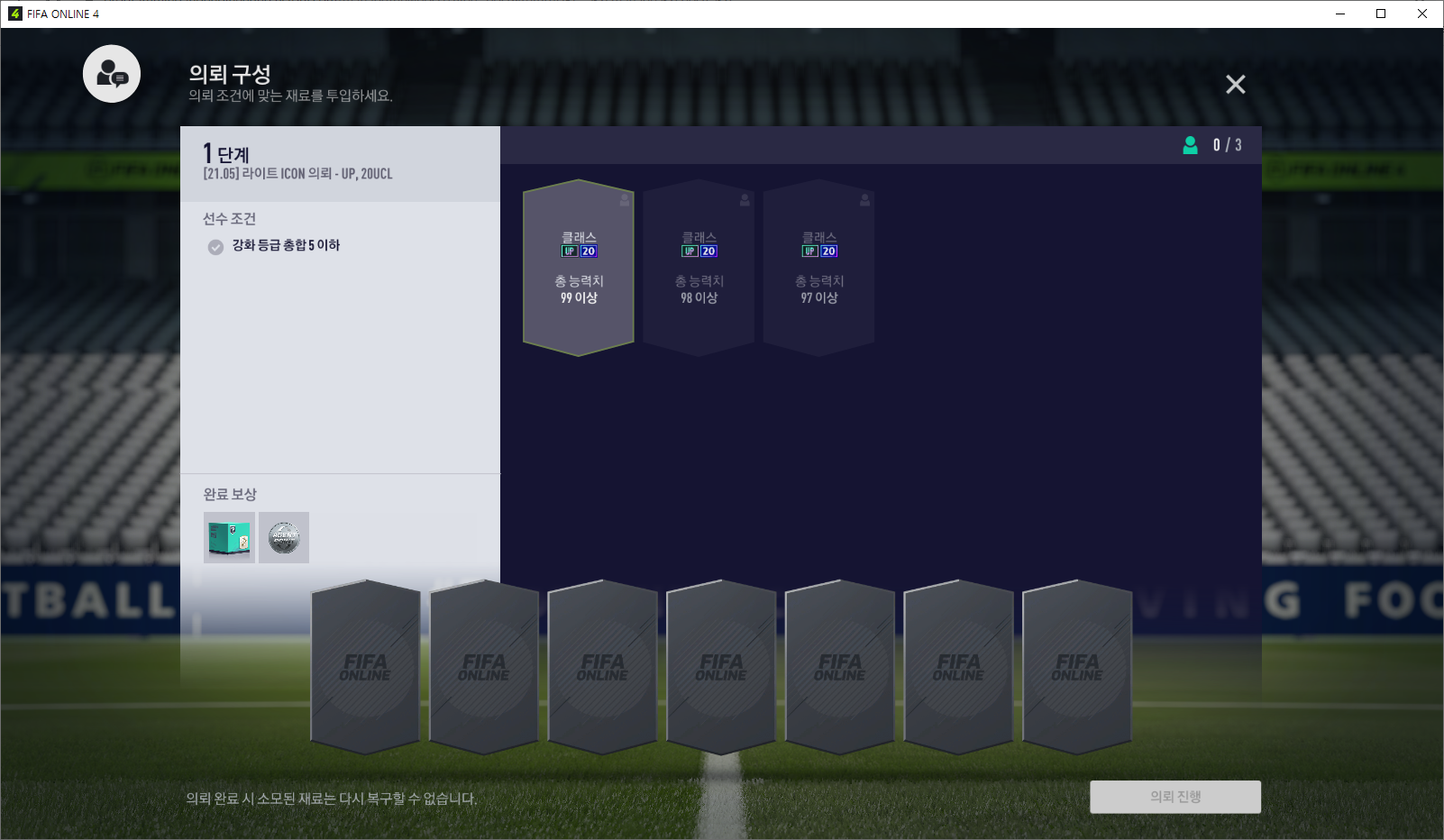 재료는 UP 시즌, 20UCL 시즌 3장이구요. 오버롤 99, 98, 97 1장씩 총 3장입니다.