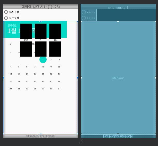 크로노미터를 클릭하기 전에는 라디오버튼, 데이트피커, 타임피커가 안 보이도록 설정하고, 크로노미터를 클릭하면 라디오 버튼이 나타나게 한다. 그리고 아래쪽 연도를 롱클릭하면 라디오버튼, 데이트피커, 타임피커가 다시 사라지게 한다.